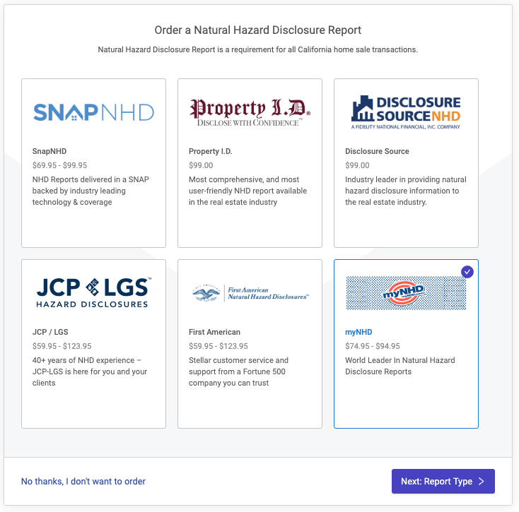 2. From here, you can select an NHD report from any of the top six NHD providers: JCP, First American, Property ID, Disclosure Source, SnapNHD and MyNHD. If you don’t see your favorite vendor on this screen, let us know! We’re excited to work with new partners.